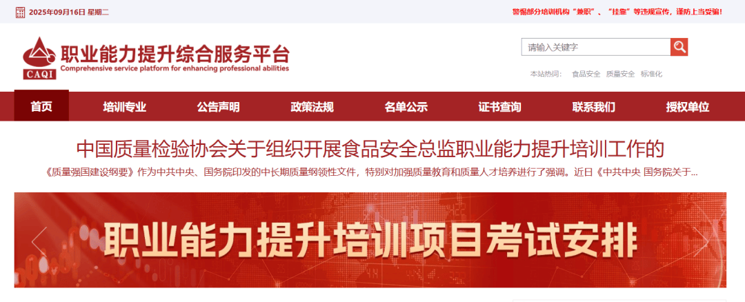 食物出产、加工企业中的高级办理人员和食物平安工做次要担任人,餐饮企业的高级办理人员和食物平安工做次要担任人,企事业单元中食物平安工做次要担任人和分担带领,畅通范畴相关企业的食物平安工做次要担任人,相关从管部分的食物平安监管人员,有志于处置食物平安办理工做的相关专业手艺人员等。培训完成报名且获得授权的进修账号后,可按照本身需要随时登录上述线上培训办事平台进行正在线年第四时度起头,拟正在每个季度的最初一个周六或周日进行培训测验(具体放置以本协会网坐发布通知为准);培训完成对应课程所需需要学时的进修后,按照相关要乞降相关登录上述线上培训办事平台正在时间内进行同一测验。第一步:正在旅逛器输入进入 中国质量查验协会官网,或者百度搜刮“中国质量检 验协会”进入官网。进 入职业能力提拔分析办事平台。第三步:进入《职业能力提拔分析 办事平台》点击进修中 心,进入登录页面输入账 号及暗码,点击登录。中国质量查验协会是由质量查验行业取质量范畴的质量查验手艺机构和专家学者、工做者,相关科研院所、大专院校、学术机构、企事业单元及质量工做取得显著成效的企业取企业担任人,取质量查验相关工做的社会相关人士等志愿结成的、行业性、非营利性社会组织,具有法人资历。中国质量查验协会筹备于1986年,并于1992年正式成立,登记办理机关为平易近政部,行业次要办理部分为国度市场监视办理总局(简称国度市场监管总局),国度市场监管总局承认检测司。国度市场监管总局2018年4月组建成立之前,中国质量查验协会历任营业从管部分为原国度质量监视查验检疫总局(简称原国度质检总局)、原国度手艺监视局、原国度经济委员会质量局。