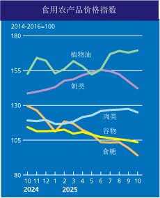 粮农组织动物油价钱指数10月平均为169。4点,较9月上涨1。5点(0。9%),升至2022年7月以来最高程度。环比涨幅次要受棕榈油、菜籽油、大豆油和葵花籽油报价走高鞭策。此中,国际棕榈油价钱正在上月回掉队小幅反弹,虽然马来西亚产量超预期,但市场对印度尼西亚打算于2026年提高生物柴油强制掺混比例将导致出供词应收紧的预期对价钱构成支持。次要因黑海地域收成延迟及农户惜售导致供应严重。取此同时,菜籽油和大豆油全球价钱别离因欧盟供应持续严重、巴西和美国国内需求增加而上涨。粮农组织肉类价钱指数10月平均为125。0点,较9月下降2。5点(2。0%),但同比仍超出跨越5。8点(4。8%)。肉类价钱指数正在持续八个月上涨后呈现回落,牛肉报价上涨仅部门抵消了跌幅。具体而言,猪肉价钱指数下跌源于全球供应较为丰裕,而欧盟出口报价则因中国实施新进口关税后进口需求削弱而承受额外下行压力。禽肉价钱指数亦显著收缩,反映出巴西出口价钱降低,缘由是正在中国实施高致病性相关商业后,该国出口商转向价钱较低的市场。此外,羊肉价钱指数下跌,出格是正在,缘由是市场供应添加。比拟之下,牛肉价钱指数继续攀升,全球不变的需求鞭策报价上涨。粮农组织乳成品价钱指数2025年10月平均为142。2点,较9月下降5。0点(3。4%),持续第四个月下跌,但同比仍超出跨越2。7%。所有分项指数本月均下跌。黄油环比跌幅6。5%,全脂奶粉为6。0%,奶酪为1。5%。黄油价钱持续下行次要反映出欧盟和出供词应充脚,暖和的季候性气温提振了奶类产量,而亚洲和中东进口需求疲软。奶粉报价也因需求无限和出口合作激烈而走低。奶酪价钱指数跌幅相对较窄,欧盟地域因奶源供应充脚、出口需求不振而导致价钱小幅下跌,但部门被大洋洲正在亚洲订单不变及季初供应偏紧支持下的坚挺价钱所抵消。粮农组织食糖价钱指数10月平均为94。1点,较9月下降5。3点(5。3%),持续第二个月下跌,同比则下跌35。4点(27。4%),降至2020年12月以来的最低程度。本月跌幅次要受全球食糖供应丰裕的预期驱动。正在巴西南部次要产区,有益的气候前提支持了近几周的强劲出产势头。泰国和印度(均已起头晚期压榨功课)的预期减产则进一步强化了全球食糖供应的积极前景,对价钱形成压力。此外,国际原油价钱下跌导致生物燃料行业需求下降,给全球糖价形成进一步的下行压力。
