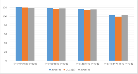 上海市企业家投资决心指数反映了企业家对于本企业出产运营现状的对劲程度和对将来的预期。2016年第四时度上海市企业家投资决心指数为114。33点,环比上升1。36点,同比持平。本季度企业家投资决心指数的分类指数全体波动幅度较小,此中表示当前企业成长情况的企业成长程度决心指数为119。71点,取上季度持平,同比下降1。46点;反映企业发卖程度的企业发卖程度决心指数是为118。11点,环比取同比均根基持平;企业盈利程度决心指数为115。73点,环比持平,同比下降1。13点。企业预期成长程度决心指数为103。76点,较前一季度上升4。22点,同比持平,具体值数值见图7。