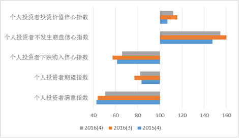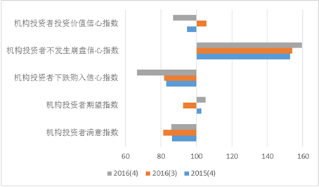 上海市投资决心指数反映了企业家、机构投资者和小我投资者对上海市宏不雅经济的对劲程度以及对将来的预期。2016年第四时度,上海市投资决心指数为113。19点,环比上升2。24点,同比持平。指数位于乐不雅区域,表白投资者群体对上海的投资见地仍较为积极。本季度投资决心指数的三个分类指数中,企业家投资决心指数为104。51点,环比上升3。35点,同比持平;机构投资者投资决心指数为115。48点,比三季度上升3。12点,同比下降1。47点;小我投资者投资决心指数为119。59点,取前季度持平,同比上升1。50点,具体值数值见图6。